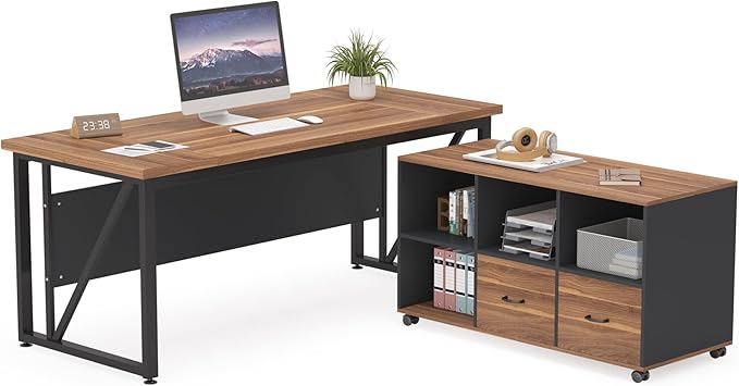 Tribesigns 63-Inch Executive Desk with 47-Inch Mobile File Cabinet, Large Home Office Desk with Drawers and Storage Shelves, L-Shaped Computer Desk Workstation Business Furniture, Walnut & Gray