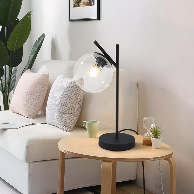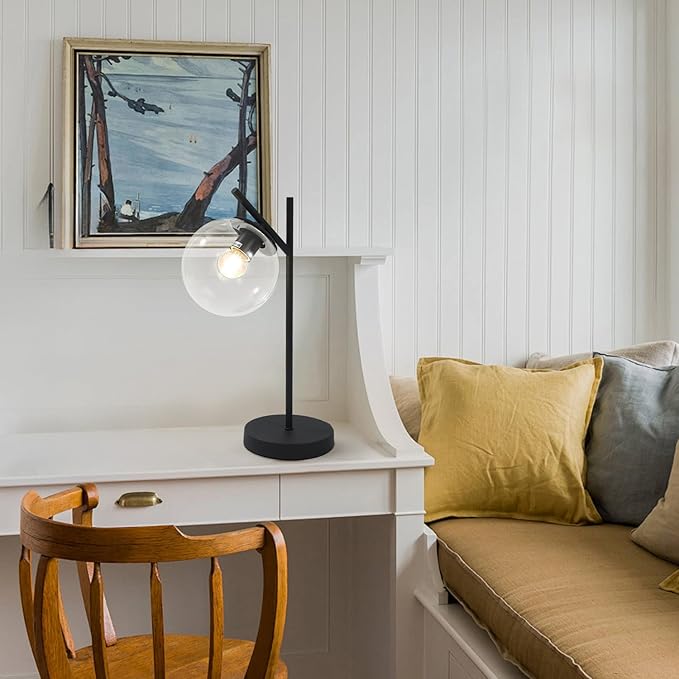 Mid Century Table Lamp Vintage Bedroom Desk Lamp Black Nightstand Lamp Contemporary Clear Glass Globe Bedside Lamp for Office Study Room