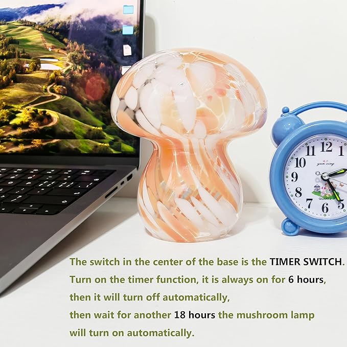 - Convenient Timer Functionality: Enjoy the convenience of our mushroom lamp's built-in timer switch. Once activated, it illuminates for a continuous 6 hours before automatically turning off. After 18 hours, it seamlessly restarts, allowing you to effortlessly set a specific time frame for daily on and off cycles.