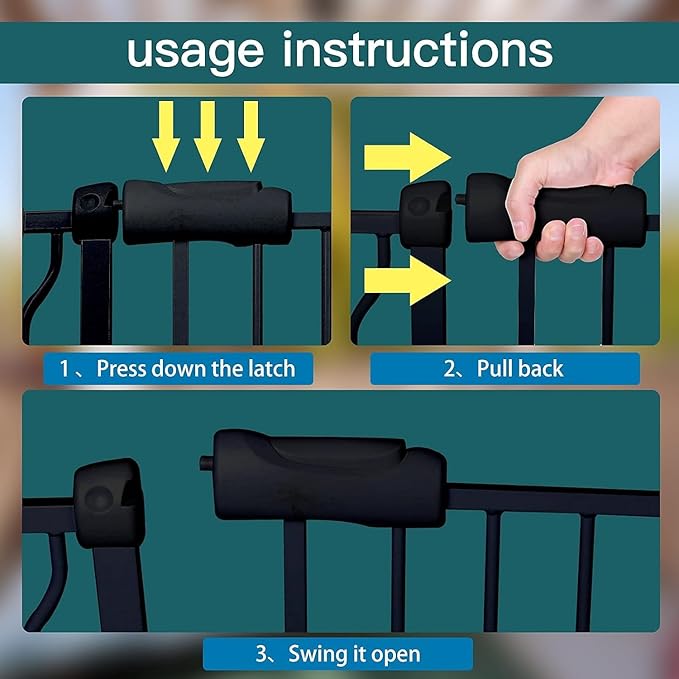- Double Locks System-The extra wide baby gate pressure mounted handle design makes it easy for adult to open: simply press the button, lift up the walk thru baby gate to open the door with single hand. But it is difficult to open it by little kids. Ultra-secure, a double-locking option up and down design to ensure the large baby gate is securely installed for optimal security.