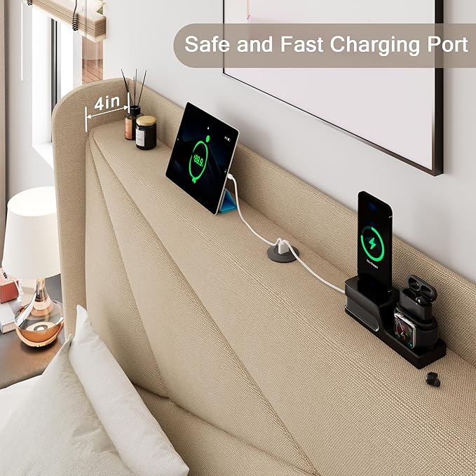 Full Size Upholstered Bed Frame with Charging Station, Platform Bed Frame with Storage Headboard, Solid Wood Slats Support, No Box Spring Needed, Beige