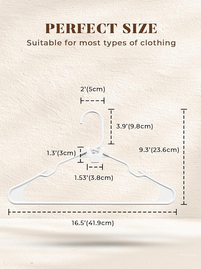 - Standard Hangers for Adult - Plastic hangers 50 pack with ideal dimensions each: 16.4"x 9.3" x 1/4". Both clothes hangers and hanger hooks have no burrs or flashes, which can protect your delicate clothes. The smooth finish of the shirt hangers keeps your elegant clothes safe from any damages, creases, or marks.