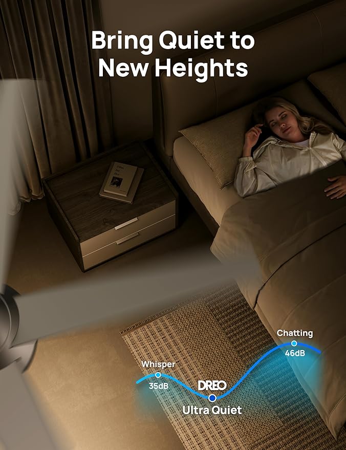 - Runs Smooth and Quiet: Dreo's Brushless DC Motor runs with less friction and optimized efficiency, achieving natural wind with noise levels lower than whisper sound, perfect to install in quiet places like bedrooms or living rooms.