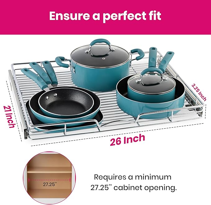 - EASY TO INSTALL & HARDWARE INCLUDED: Our pull out cabinet organizer dimensions measure 26”W x 21”D x 3.25” and includes simple step-by-step instructions along with all of the hardware necessary for easy installation. Installs with just a few simple screws, and Fits cabinet openings 27-1/4”and larger