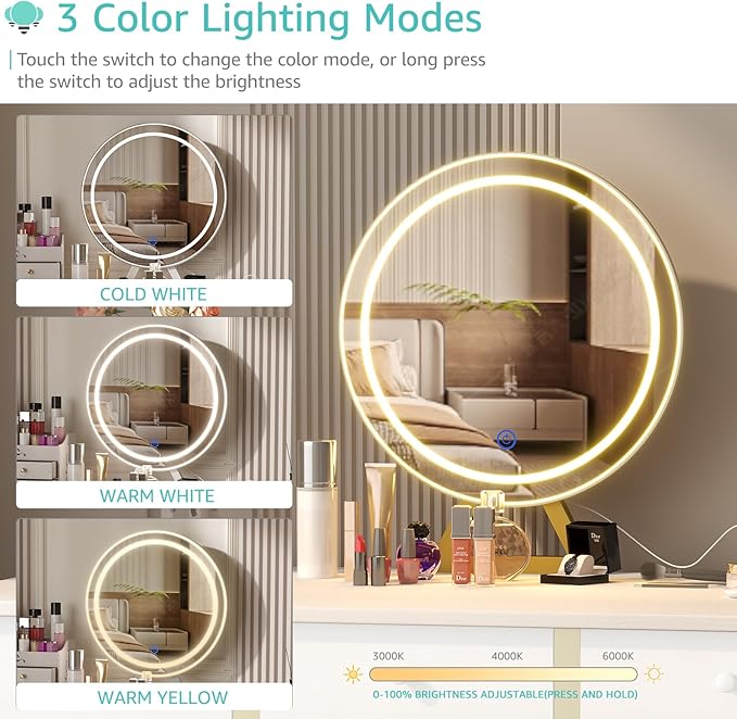 - Round Mirror with LED Light: This make up vanity desk comes with a lighted mirror which have 3 different settings: warm yellow, warm white and cold white light colors. Touch the switch to change the color mode, or long press the switch to adjust the brightness. It can meet your different needs, perfect for home make up, salon or live broadcast. The desk is USPTO Patent Approved(Patent Number: 29966423)