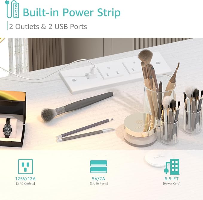 - Vanity Table with Charging Station: This makeup vanity table features a power strip, includes 2 standard plug sockets and 2 USB ports, which can be more convenient to connect your hair dryer, curling iron, and it can also charge your phone, tablet or other mobile devices.