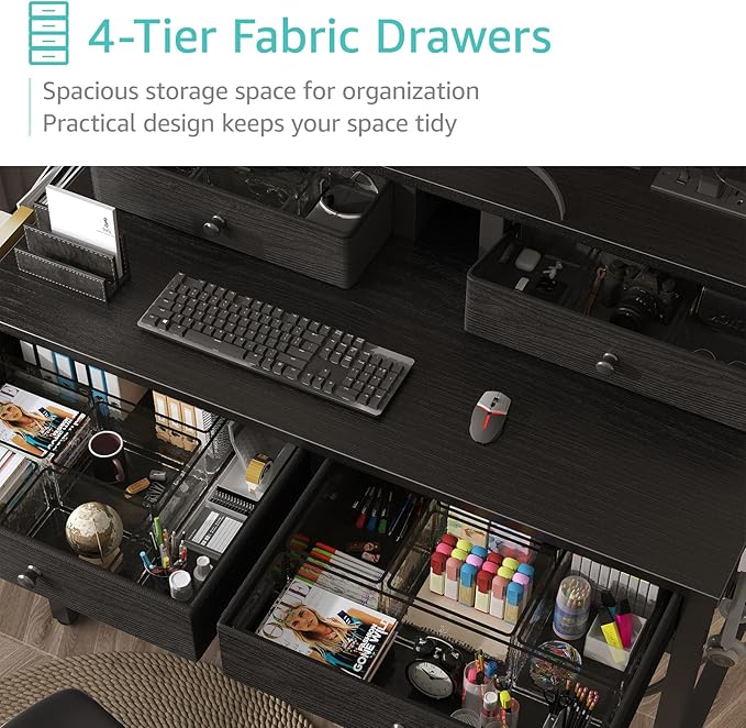 Lufeiya Small Desk with Drawers for Home Office Bedroom, 31 inch Black Writing Study Desks with Fabric Drawers Storage, Gaming Desk Table with Power Outlet & Monitor Stand, Black
