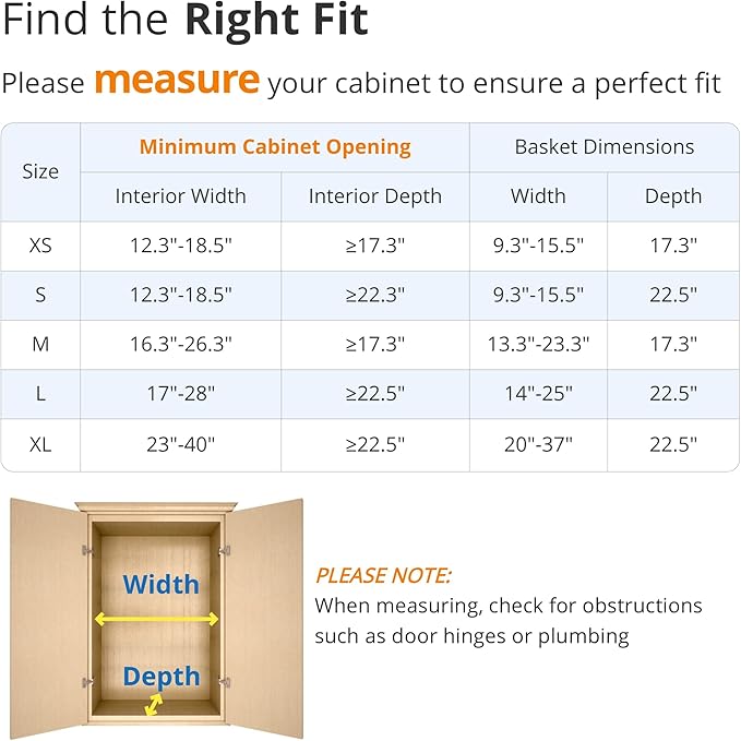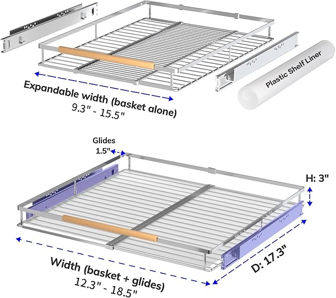 - Expandable Width: This slide out cabinet organizer adds the ability to adjust the width. Size small is perfect for cabinet openings measuring 12.3" to 18.5" in width and 17.3" in depth. Upgrade your storage space and enjoy easy access to your items with these practical and functional pull-out shelves.