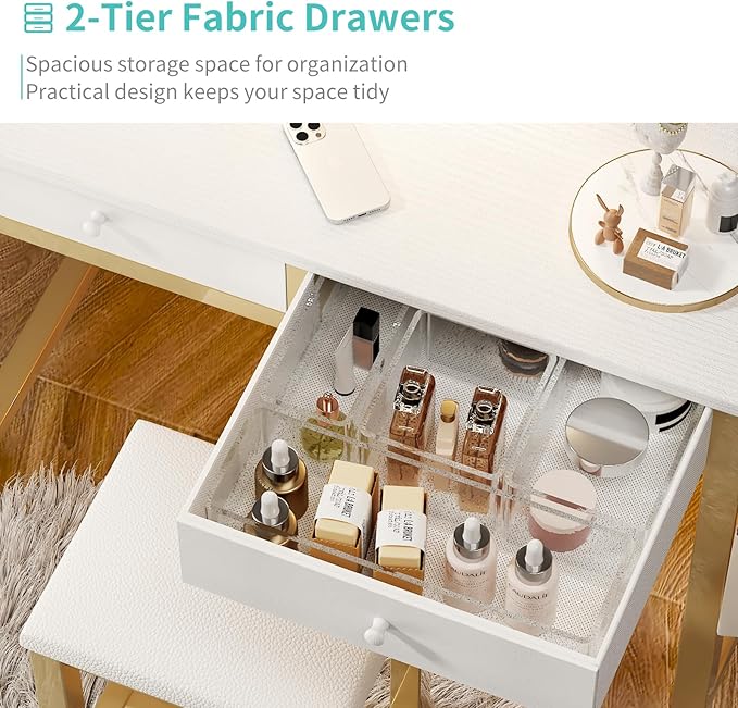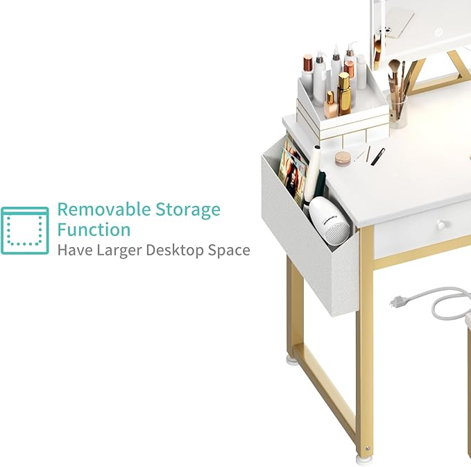 Lufeiya Small Makeup Vanity Desk with Mirror and Light, 32 inch White Vanity Desks Sets with Fabric Drawers for Girls Teen, Dressing Table and Chair Set with Power Outlet for Bedroom, White Gold