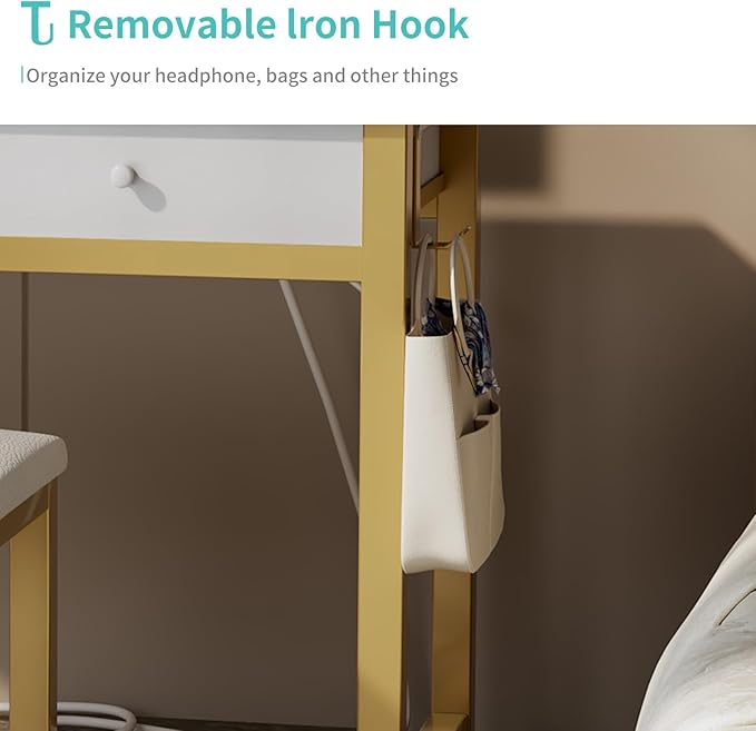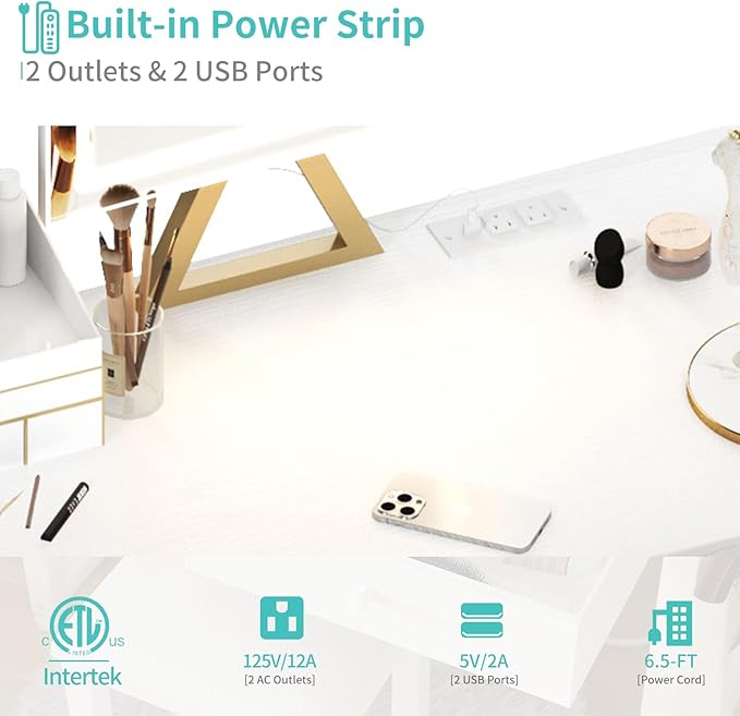 - Vanity Table with Charging Station: This makeup vanity table features a power strip, includes 2 standard plug sockets and 2 USB ports, which can be more convenient to connect your hair dryer, curling iron, and it can also charge your phone, tablet or other mobile devices