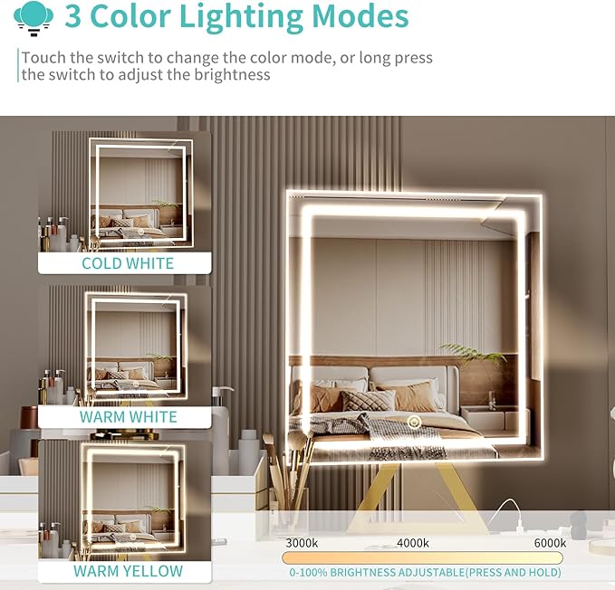 - Square Mirror with LED Light: This make up vanity desk comes with a lighted mirror which have 3 different settings: warm yellow, warm white and cold white light colors. Touch the switch to change the color mode, or long press the switch to adjust the brightness.It can meet your different needs, perfect for home make up, salon or live broadcast. The desk is USPTO Patent Approved(Patent Number: 29966422)