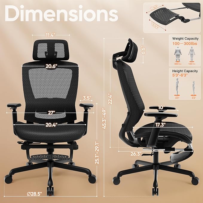 - 【Product Dimensions】Overall Height: 45.3" - 49"; Width: 28.5"; Seat Height: 19" - 22.8"; Seat Depth: 17.3"; Seat Width: 20.5". The footrest smoothly retracts when not in use, preserving your space.