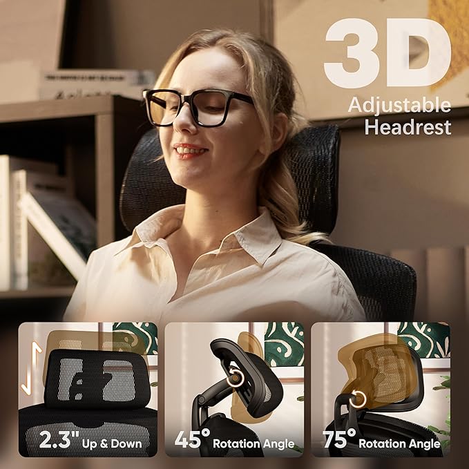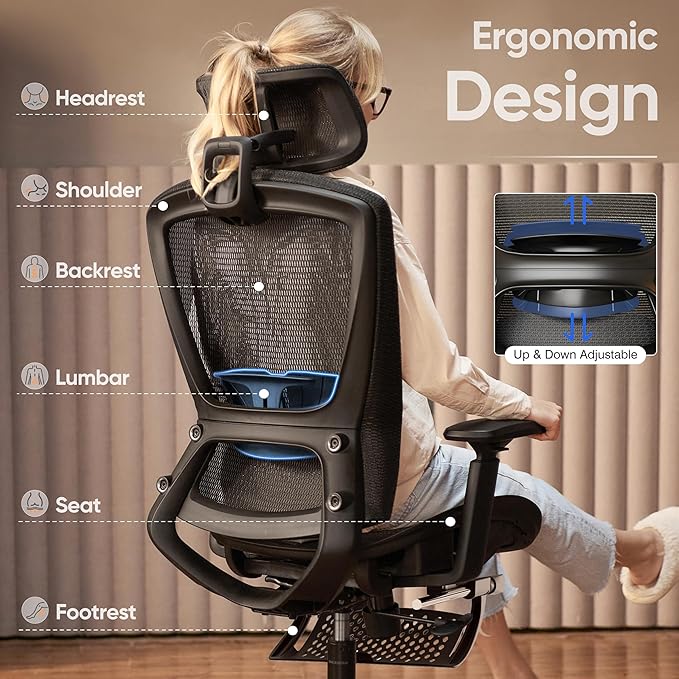 - 【Upgraded Ergonomic Design with Headrest and Footrest】Experience ultimate relaxation with our newly upgraded office chair, featuring an adjustable headrest and retractable footrest. The breathable mesh backrest is crafted with a bionic curve to automatically correct sitting posture. Combined with recline tension adjustment, a 3-position recline lock, and customizable lumbar support, this chair effectively relieves lower back pain—perfect for long hours of work or rest.