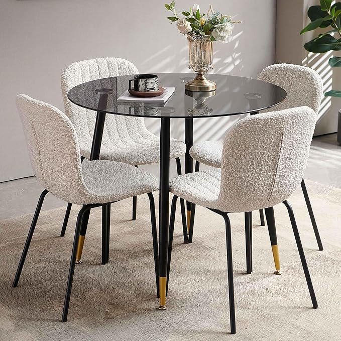 Modern Kitchen Table Set for 4, 5 PCS Grey Glass Round Dining Table Set, 35.43" Round Kitchen Table Transparent with 4 Upholstered Accent Chairs Comfortable Dining Chairs