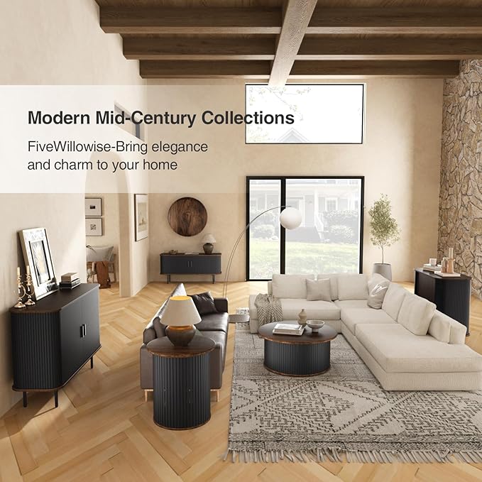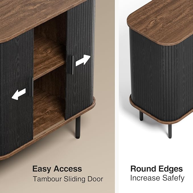 - Modern Mid-Century Style: Roller shutter sideboard features an oval walnut grain panel, sliding roller shutter doors and rustic black handles. It makes efficient use of built-in storage space, ensuring that the stored items are not exposed. Use it as a coffee table or wine table, whether placed in the living room, foyer or office, the arched groove cabinet will add charm to your home