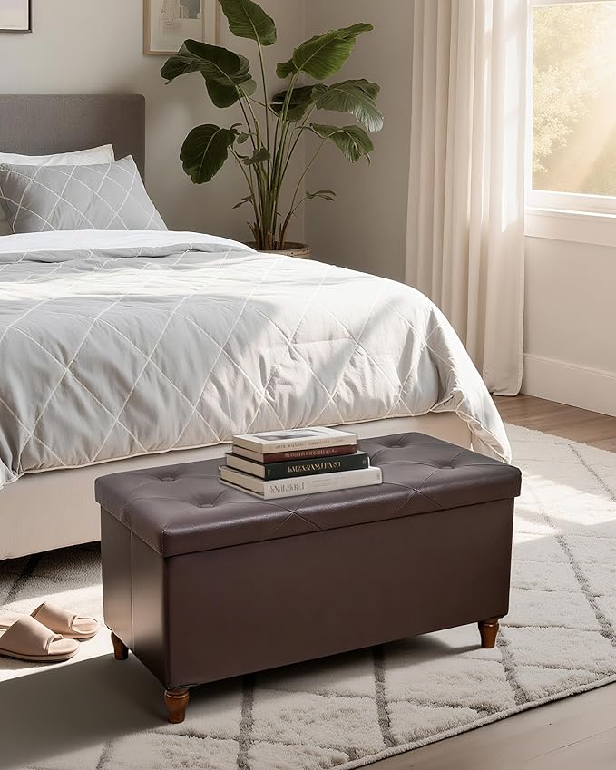 GLAXYFUR 30 Inches Storage Ottoman Bench with Wooden Legs, Faux Leather Folding Ottoman Foot Rest, Storage Bench for Living Room, Hallway & Bedroom, Upgrade Large Capacity (Engineered Wood, Brown)