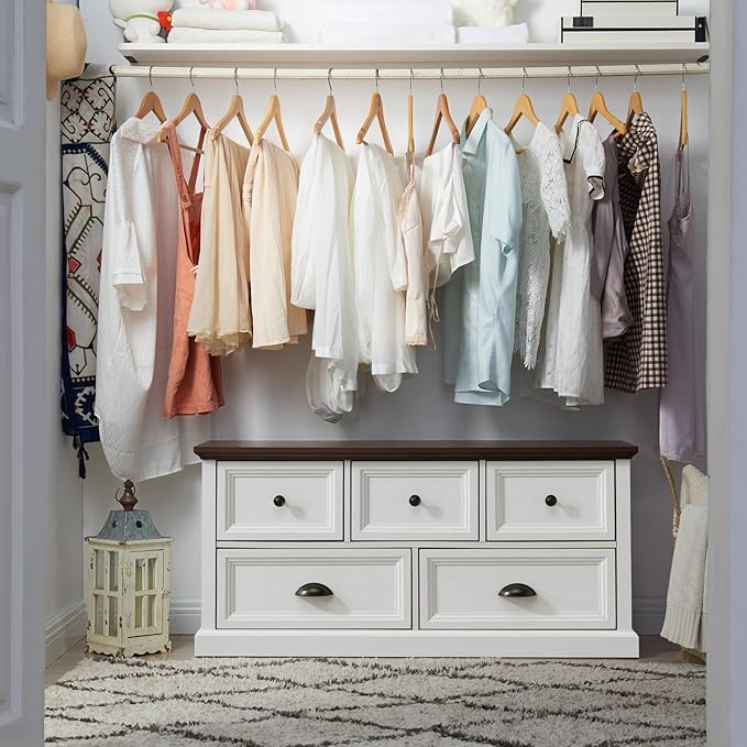 Farmhouse 5 Drawers Dresser for Bedroom, 45" Wide Chest of Drawers, 21" Tall Storage Closet Bench Storage Chest Storage Trunk, Wood Rustic Dresser for Closet, Living Room, Hallway, White