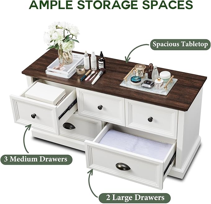 - Large Storage Space: Farmhouse Farmhouse wooden 2 drawer with elegant shell shaped pulls and 3 round hardware handles adding a touch of sophistication to the rustic charm of the piece. 5 drawers pre-installed Ball Bearing Drawer Slides ensure that the drawers open and close smoothly and easily every time.Even if it is used too hard, it will not damage the slide rail and furniture.