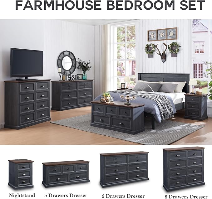 - Farmhouse Style: Farmhouse wooden 5 drawer dresser featuring 5 Standard drawers. The light rustic oak lacquer finish paired with the wood top combines vintage elements to add character and charm to your bedroom and living room. It's a simple and striking combination for those who love farmhouse style. The bedroom dresser is made of durable engineered wood for long-term use, scratch resistant. No strong odor. The widened dresser legs made the dresser not slide easily, providing great durability and stability.