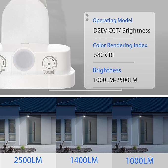 - Adjustable Design: The LED outdoor security light features an adjustable 1 head design that allows you to customize the angle at any direction. This AWSENS outdoor flood light also features CCT dimmable technology. You can adjust the CCT color (2700K/ 4000K/ 5000K) from cool (security) to warm (neighbor friendly) by "CCT" switch, and supports 3 lumen levels (1000LM/ 1400LM/ 2500LM) by "LUMEN" switch on the backplate.