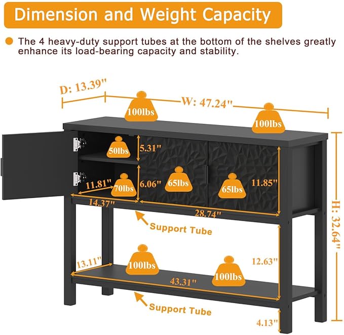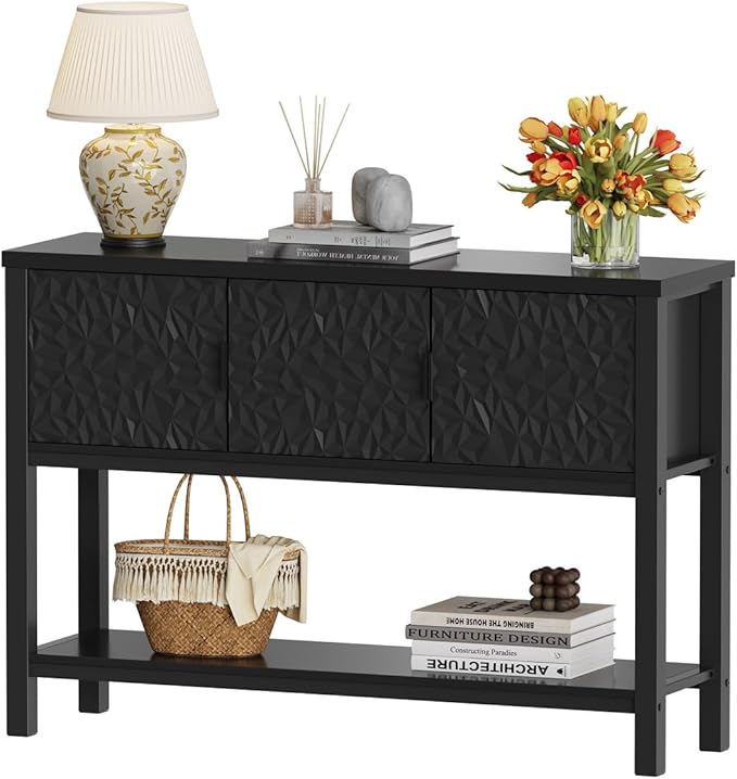 - [Super Sturdy Console Table]: Featuring diamond-patterned wood doors with a raised texture, this console table exudes luxury and sophistication, enhancing the elegance of any space. The four support tubes beneath the shelves provide superior weight capacity and stability, making it perfect for any farmhouse hallway or entryway