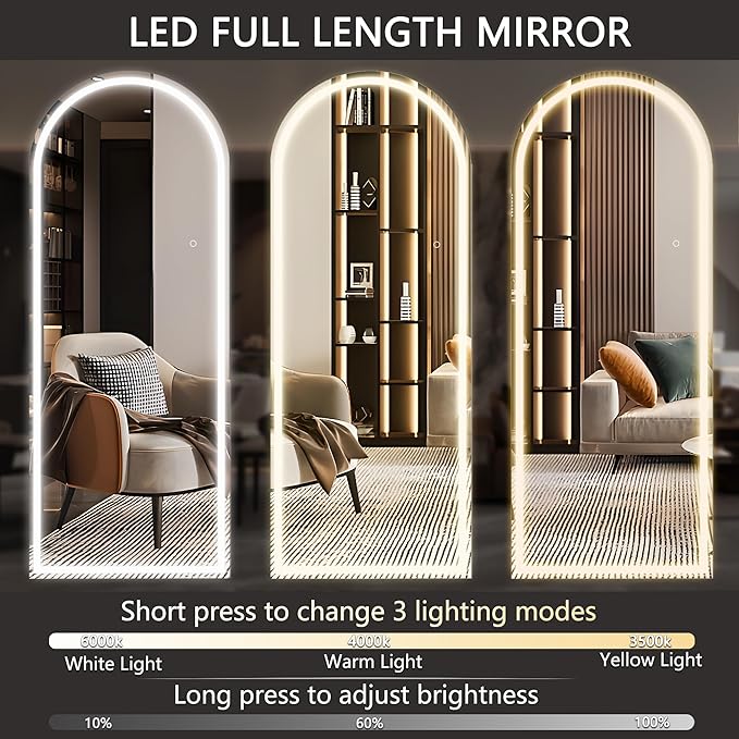 Hasipu 75" x 28" Led Mirror Full Length, Arch Mirror Full Length with Lights, Floor Full Body Glass with Stand,Tempered Glass,Shatter-Proof, Dimming & 3 Color for Bedroom Cloakroom-UL