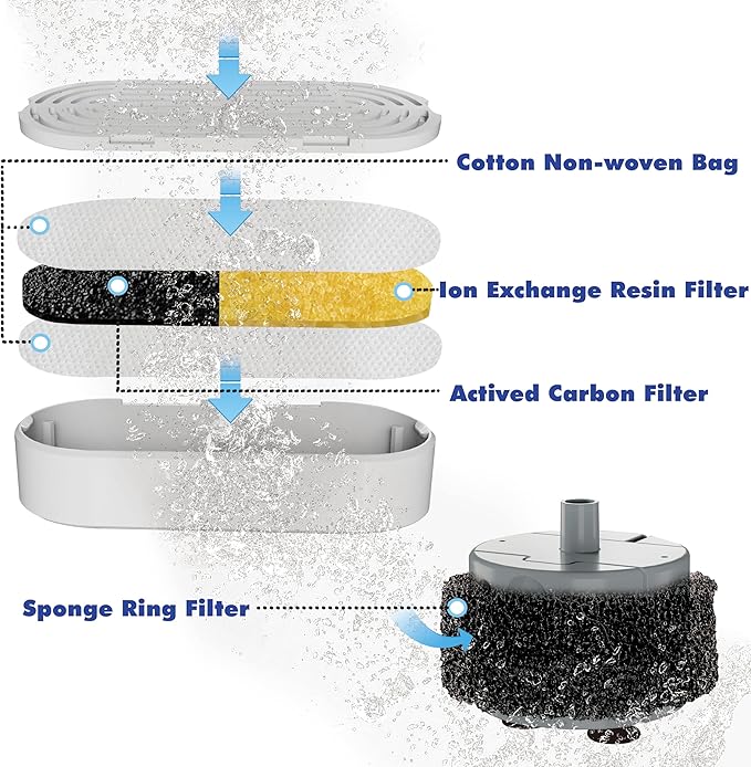 - Low Noise Pump:The pet water fountain equipped with an altra quiet pump, a sponge filter will remove visible impurity like hair so the pump will be more durable. We suggest making deep clean once a month for the pump.