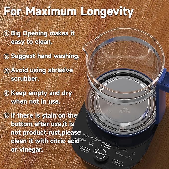 - 【Easy to Use】This electric tea maker is easy to use, rotate the MENU knob in the clockwise or anticlockwise directions to choose your desired function without setting up time or temperature, and then you just need to waiting for the cooking time end and enjoying the food.The kettle's wide mouth makes it easy to clean.