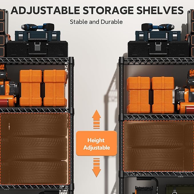 - ADJUSTABLE HEIGHT: Enjoy the option for a completely customizable metal shelving unit. The build allows for height adjustments - giving you the freedom to adjust accordingly to your needs. its coating ensures it is waterproof