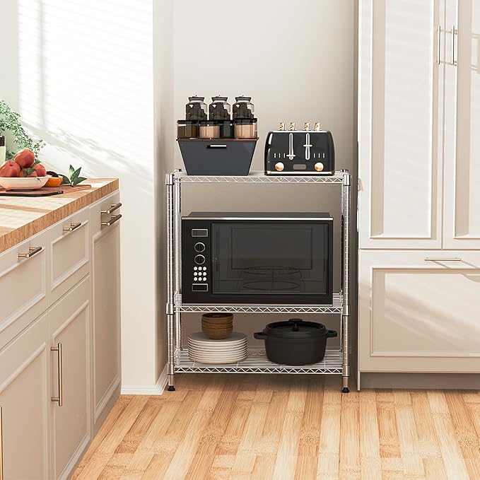 750 lbs 3 Tier Storage Rack Metal Wire Shelving Unit, Storage Standing Shelf Organizer for Laundry Bathroom Kitchen Pantry Closet Garage Basement Utility Room, Chrome 13.8" D x 29.5" W x 35.5" H