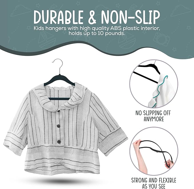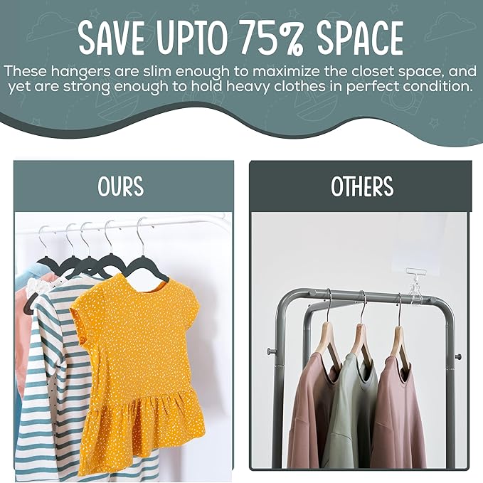 - PREMIUM QUALITY SLIM KIDS HANGERS : Protect delicate baby clothes with slim kids velvet hangers 50 pack - gentle, lint-free, notched shoulders prevent slipping and maintain perfect finish.