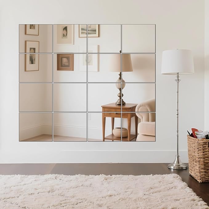 - MIRROR SIZE - Set of 16 frameless real glass mirrors, each mirror tile is 14 x 12 inch. Advanced polishing technology makes safe and delicate edges