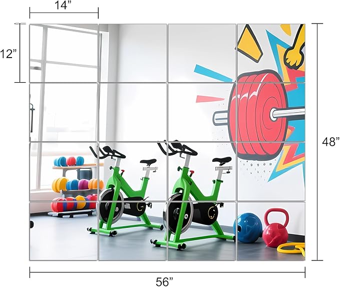 Ruomeng Home Gym Mirrors 14" x 12" x 16Pcs Wall Mounted Mirror Glass Frameless Full Length Mirror Tiles for Home Gym, Bedroom, Door & Bathroom