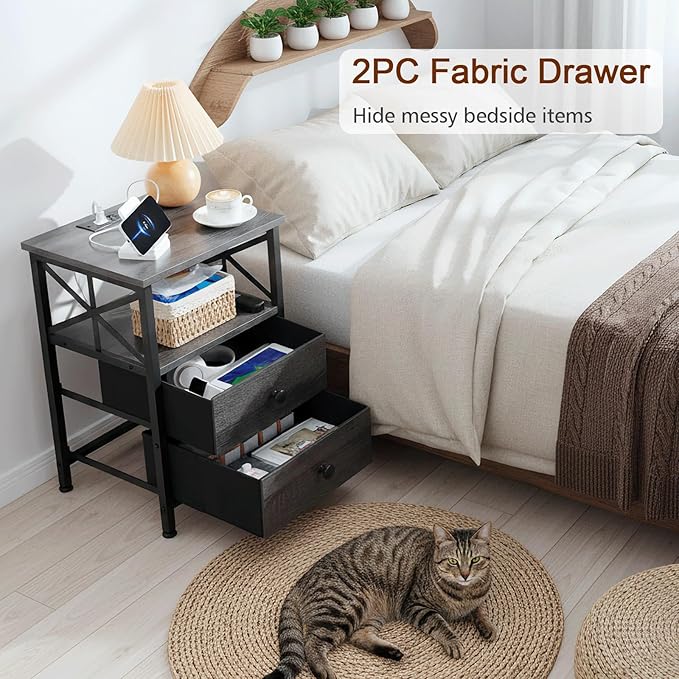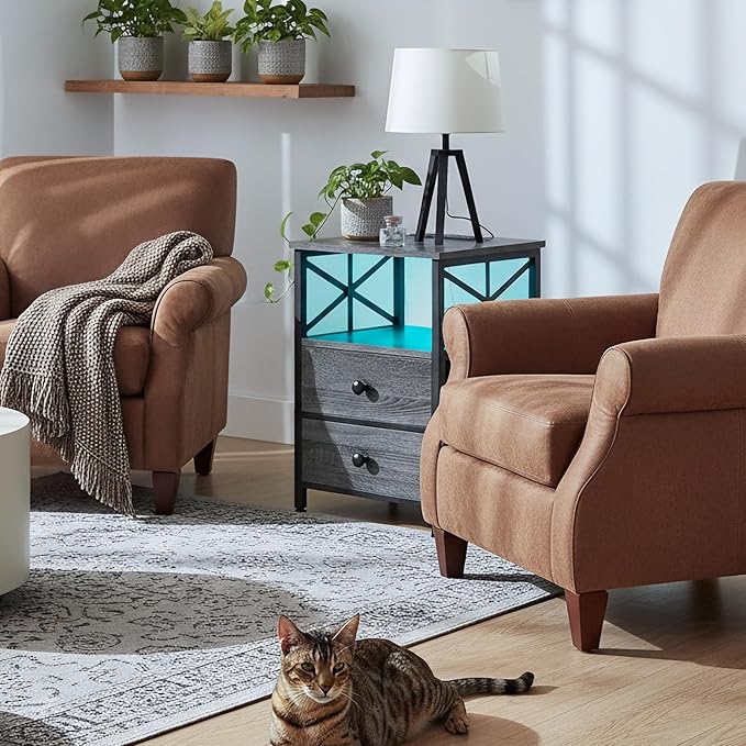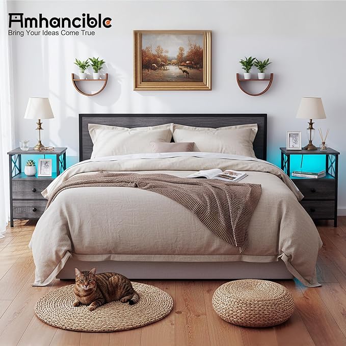 AMHANCIBLE Night Stand Set 2, LED Nightstand with Charging Station, End Tables Living Room with Fabric Drawers, Bedside Table for Bedroom, Dark Grey HET052LDG