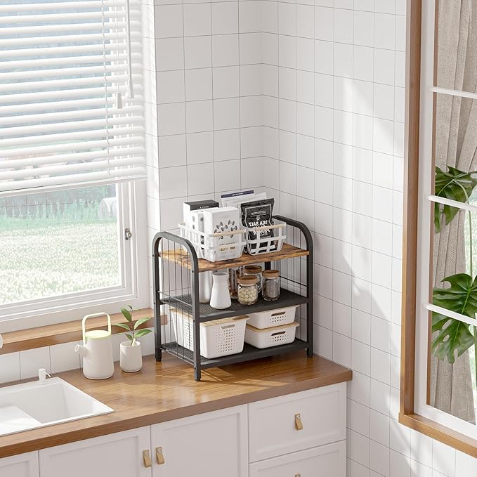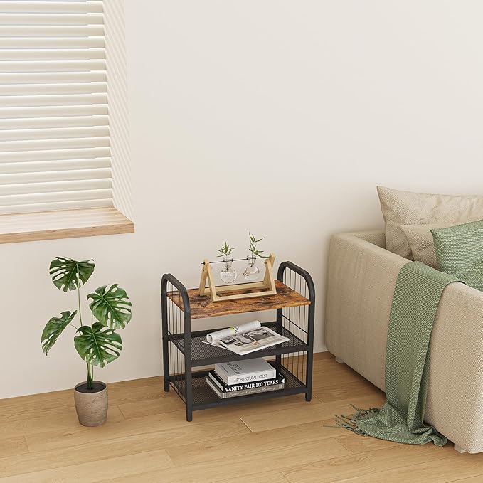 Shoe Rack, 3-Tier Shoe Organizer with Guardrails, Heavy-Duty Metal Mesh Shelves & Rustic Wooden Top for Stylish Closet & Front Door Storage
