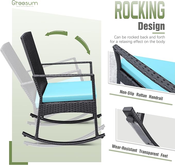Greesum 3 Pieces Patio Furniture Set Outdoor Wicker Rocking Chairs with Glass Coffee Table for Garden Backyard Porch Poolside, Blue