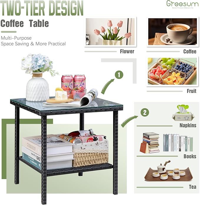 - Two-Layer Coffee Table: The double-tiered coffee table design makes for a better use of space on the table, you can put down more of the things you use outdoors.