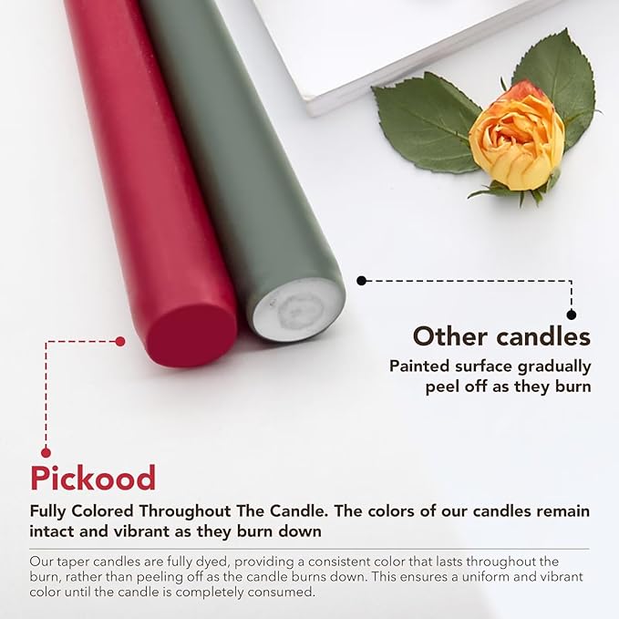 - 【Discover the Difference with Pickood】Imagine creating a festive ambiance with Pickood's Christmas Taper Candles. Perfect for the holiday season, these candles enhance your Christmas celebrations. Available in 10-inch and 12-inch sizes, they cater to diverse preferences.