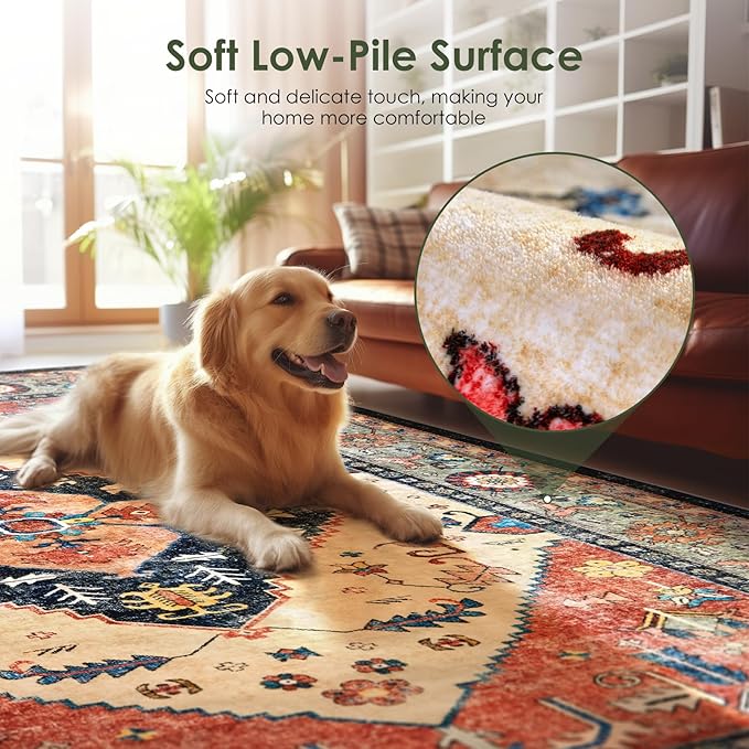Washable Living Room Area Rugs - 9x12 Large Soft Machine Washable Non-Slip Low Pile Area Rugs, Vintage Oriental Neutral Carpet for Bedroom Dining Room Dorm Office Decor Red/Beige
