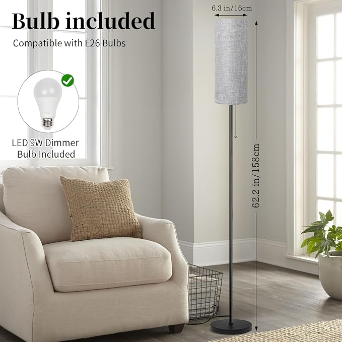 Floor Lamp for Living Room, Modern Standing Lamps with Lampshade, Minimalist Tall Lamp with Chain Switch for Living Room, LED Bulb Included (Gray Shade)