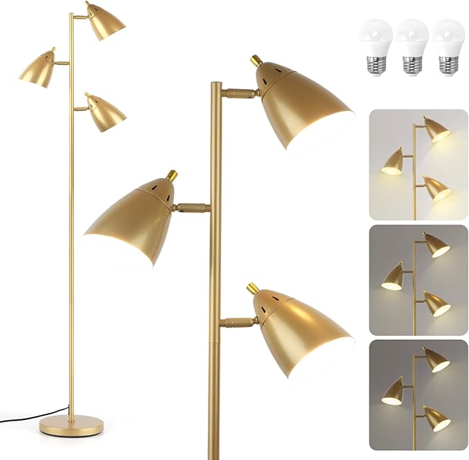 Tree Floor Lamp for Living Room, Industrial 3-Light Standing Lamp with 3 LED Bulbs, Adjustable Rotation Heads, Standing Tall Pole Lamp Farmhouse Rustic Reading Lamps for Bedroom Office (Gold)