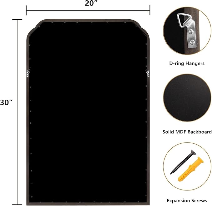 - Easy to install: back of the frame mirror has reinforced D-ring clips, measure the distance between the centers of the two back clasps, then use a ruler to draw the same distance on the wall, use a drill bit to make two holes where the hardware will be installed, install a screw in each hole until the screw head is about 0.2 inches from the wall, and finally secure the mirror.