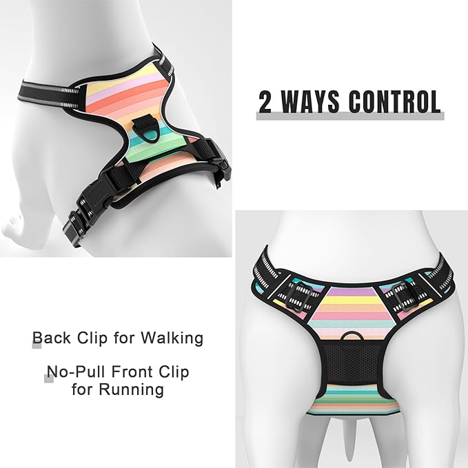 - No Pull No Choking: Our dog harness featured with 2 metal leash attachment,front clip prevent pulling and back for relaxed walking. The vest-style design disperses the pressure through shoulders and chest, no need to worry about the danger of choking