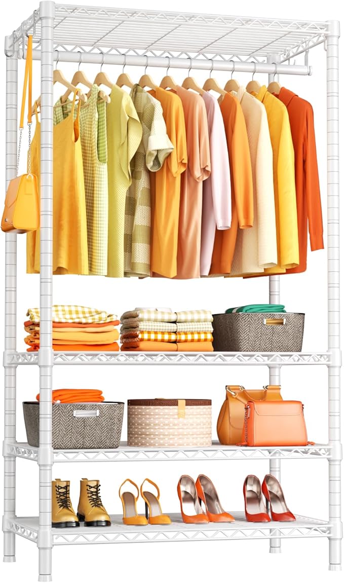 - [Sturdy & Stable]: The quality 4-tier closet garment rack is made from long-lasting metal materials, ensuring it can withstand the weight of your clothes. The leveling feet and anti-ti device add sturdiness to it