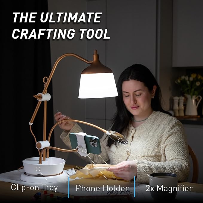 - ULTIMATE VERSATILITY WITH 3 BONUS ACCESSORIES: The Anita Table Lamp comes with a versatile set of accessories that enhance your crafting experience: a clip-on tray to keep your crafting tools organized and within reach, a flex arm magnifying lens for magnified viewing of fine details, and a phone clamp for hands-free video recording or referencing patterns on your smartphone.