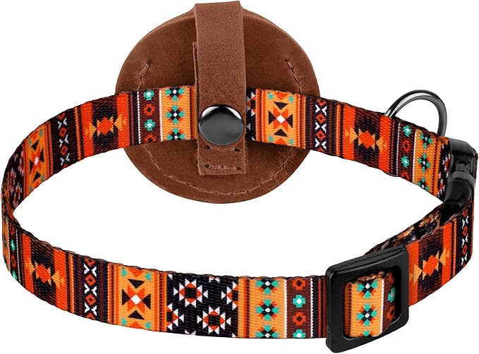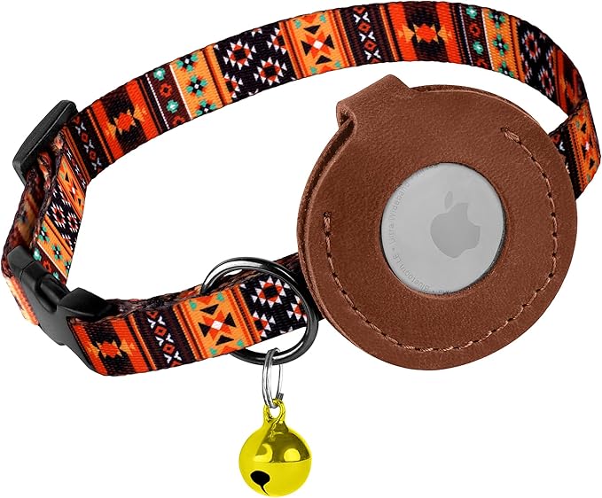Airtag Cat Collar with Bell - Non Breakaway Soft Pet Collar with Leather Air Tag Holder - Adjustable GPS Anti-Lost Collars for Girl Boy Cats Kitten Puppies, Lightweight and Patterned (Tribal Orange)