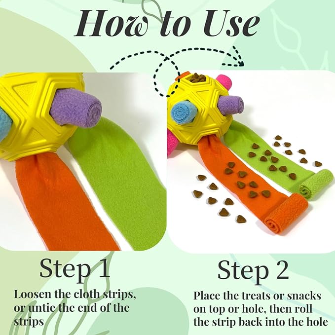 - Easy to Use And Fun: Simply untie any cloth strip end, place a snack, roll it up and put it back into the sniffing ball hole. It's a challenge your pet would be thrilled to take on pulling out the cloth, unrolling it, and find their treat!