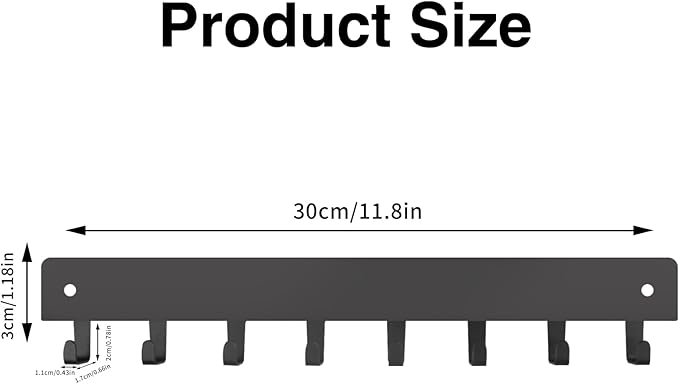 - 【Product Specifications】The overall dimensions of this key holder are 11.8 inches (L) x 1.18 inches (W), and its single hook measures 0.78 inches (L) x 0.66 inches (D) x 0.43 inches (W). Its unique design contains 8 right-angled hooks. This special design ensures that the items you hang on it will not slip off easily. Each right-angle hook provides secure support while keeping your space neat and organized, allowing your items to be stored and displayed in an organized manner.