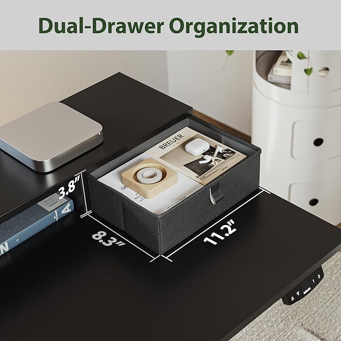 - 【Keyboard Tray & 2 Fabric Drawers】The 2 fabric drawers above the desktop can organize your clutter and keep the desktop clean and tidy at all times. This stand up desk comes with a slide-out keyboard tray to help you use your keyboard and mouse more ergonomically. The tabletop is made from low-VOC materials and meets federal and state safe air standards.