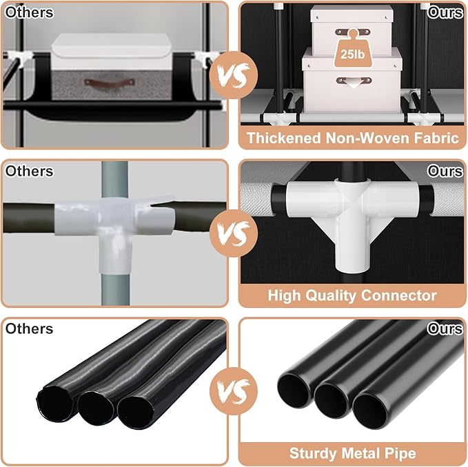 - [Sturdy Portable Wardrobe] This metal wardrobe closet is made of 0.6 inch diameter metal tubes, reinforced plastic connectors, and high-quality non-woven fabrics ensure that the tall wardrobe closet is sturdy and durable, meet your long-term storage needs. The hanging rail holds up to 33 lb, and each shelf is 15 lb, providing a firm support for your clothes. This covered garment rack provides super strong bearing capacity, can be used with confidence.